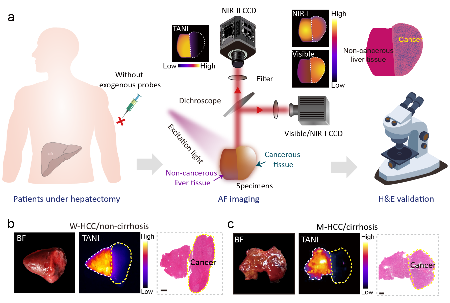 1月20日,相关研究成果以《无标记组织近红外二区自发荧光成像技术用于人肝恶性肿瘤可视化》(Label-free tissue NIR-II autofluorescence imaging for visualization of human liver malignancy)为题,在线发表于《自然·生物医学工程》(Nature Biomedical Engineering)。