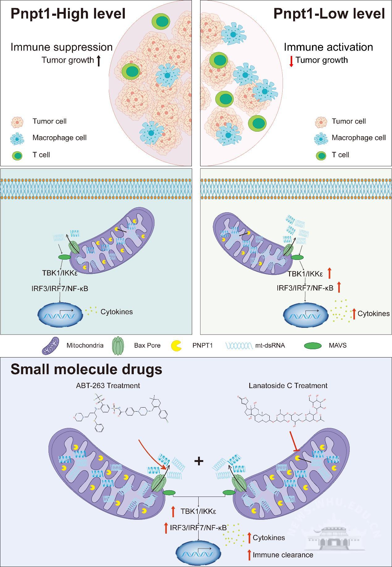 针对这些临床痛点,武汉大学蓝柯教授团队系统揭示了线粒体RNA(mtRNA)衍生的危险信号(danger signal)在激活天然免疫和抗肿瘤治疗中的关键作用,成功锁定PNPT1蛋白为该通路的调控核心,由此提出新的联合治疗策略,为克服肿瘤耐药、提升免疫治疗响应提供了新的思路。该研究以“PNPT1-mtRNA axis mediates chemotherapy-induced immune signaling and can be targeted to overcome therapeutic resistance”为题,于2026年1月26 日发表于Vita。