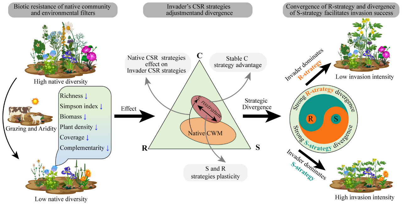 ????图2:机制图展示了沿入侵梯度,黄花刺茄(Solanum rostratum)在耐胁迫(S)策略和先锋者(R)策略之间转变。这些转变受到原生群落特性和放牧压力的影响,这些因素共同推动了与本地物种的策略分化,并最终促进了其在异质环境中的入侵成功