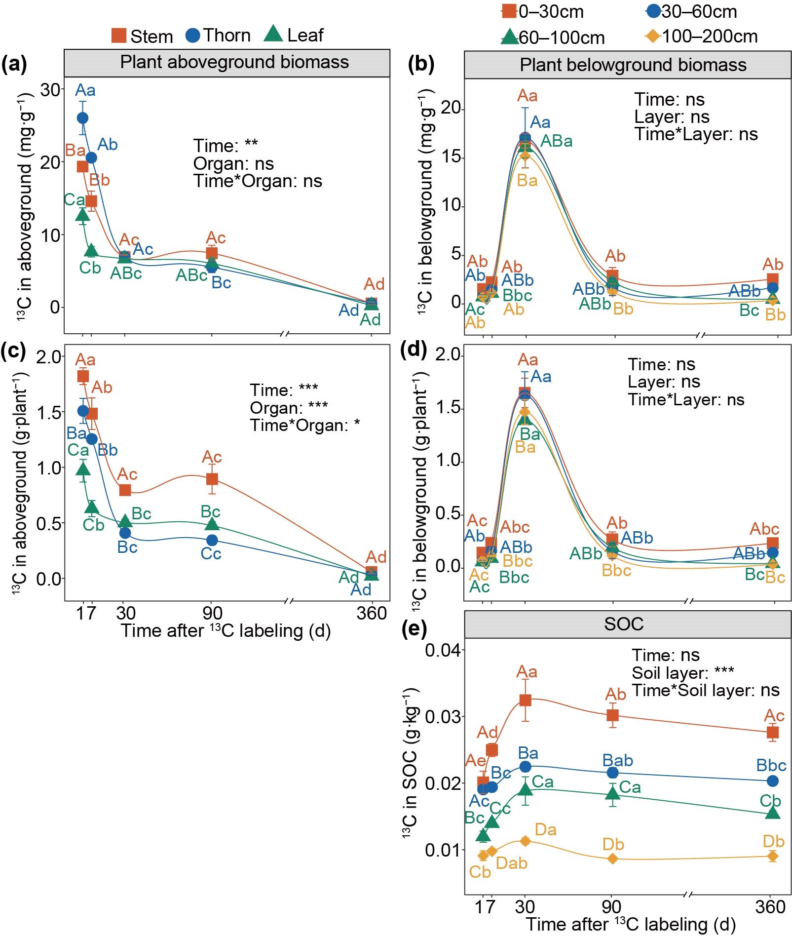 ????在全球干旱区持续扩张与“双碳”目标推进的背景下,深入理解荒漠深根植物光合碳在土壤中的分配与稳定机制,对提升干旱区碳汇功能具有重要意义。然而,植物光合碳如何在不同土层中分配,并通过植物残体与微生物残体途径影响土壤有机碳(SOC)的长期稳定性,仍是当前研究的难点。
