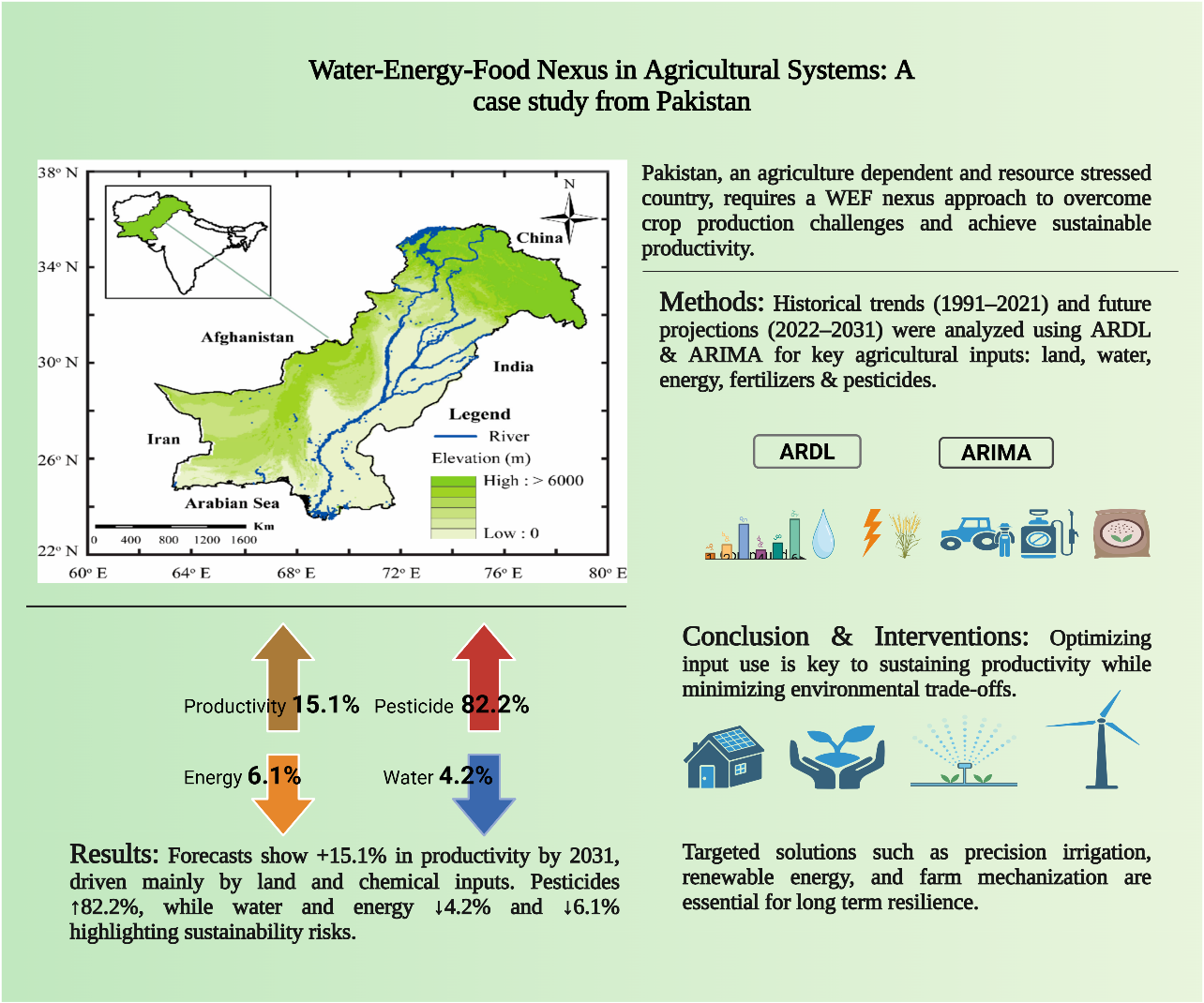 ????在国家自然科学基金“气候变化背景下中巴经济走廊水-能-粮系统安全性评价与适应性机制研究”项目和科技部“外国青年人才计划”资助下,中国科学院新疆生态与地理研究所陈亚宁研究员团队对此开展了系统性研究,基于先进的计量经济学模型,分析了巴基斯坦长达30年的农业、水文和能源数据,并对未来趋势进行了预测。研究结果表明,巴基斯坦农业消耗了全国近90%的淡水资源,但小麦单产仅为全球平均水平的一半。这种低效利用主要源于不断增长的投入需求与日益减少的资源供给之间的持续失衡。并且,预测在2031年前若要实现15.1%粮食产能提升,就需要将农药使用量增加82.25%,化肥施用量增加19%,并持续扩大5.42%的耕地面积。与此同时,农业可用水资源预计将减少4.22%,能源可用性将下降6.15%。由此也反映了从传统高投入农业模式向WEF协同管理新范式转型的紧迫性。基于研究结果,团队提出了系列政策建议:推广可节水15-20%的滴灌系统;发展太阳能灌溉以缓解能源约束;实施可降低化学品依赖度达40%的病虫害综合治理;推进体制机制改革以加强跨部门协同,优化现有资源配置,将资源使用效率、可再生能源应用、农业化学品均衡使用和跨部门制度协调有机结合,实现可持续的农业生产率提升。