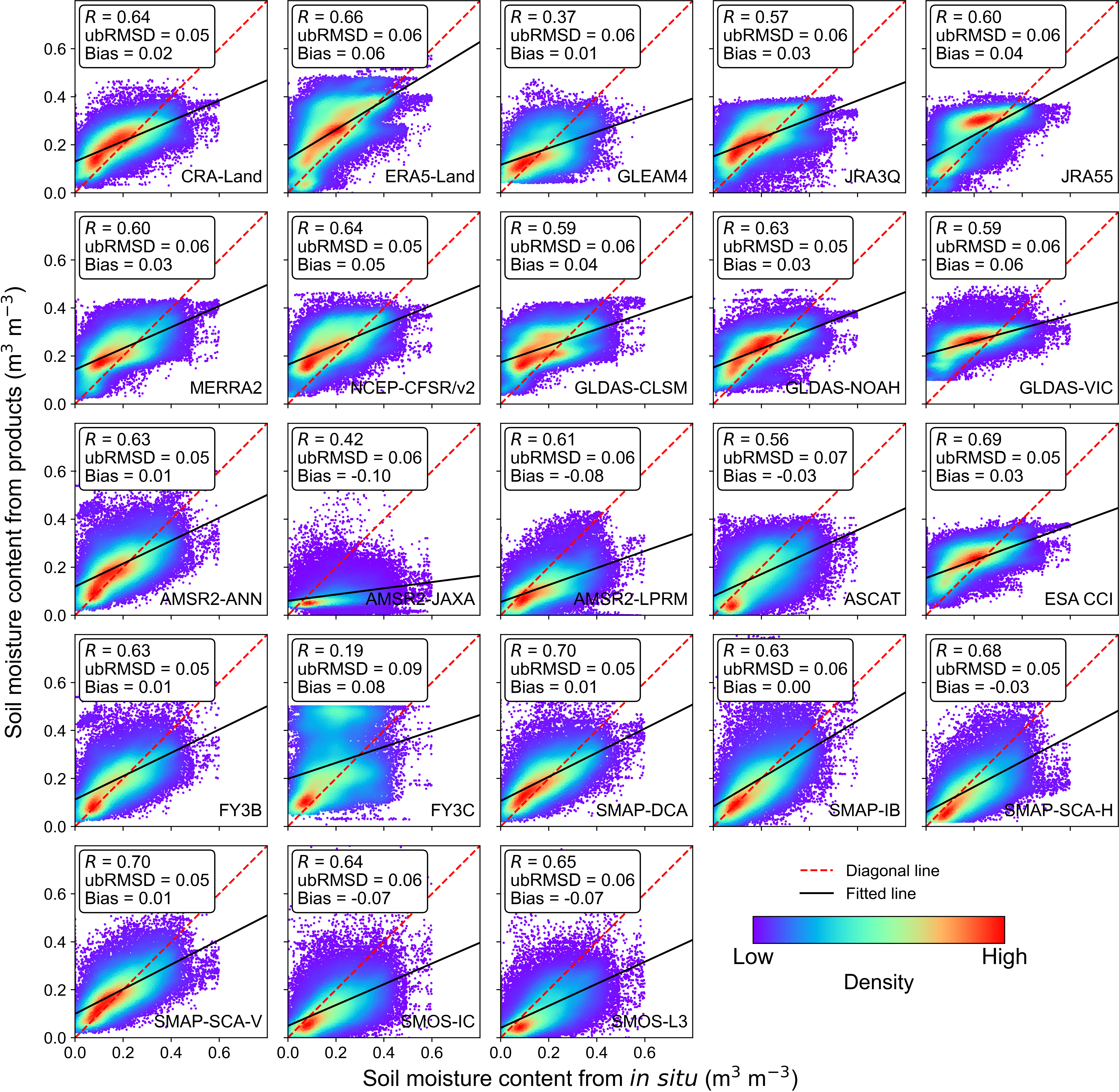 图2:土壤水分数据集与全球992个地面站点观测值的散点密度对比图