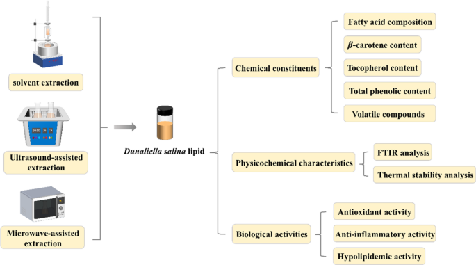 三种不同提取方法用于提取盐生杜氏藻(Dunaliella salina)脂质的比较:化学成分分析及体外生物活性研究