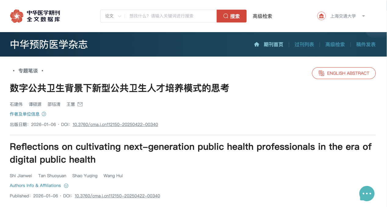 中华预防医学杂志 | 公共卫生学院王慧/石建伟等发表“数字公共卫生背景...
