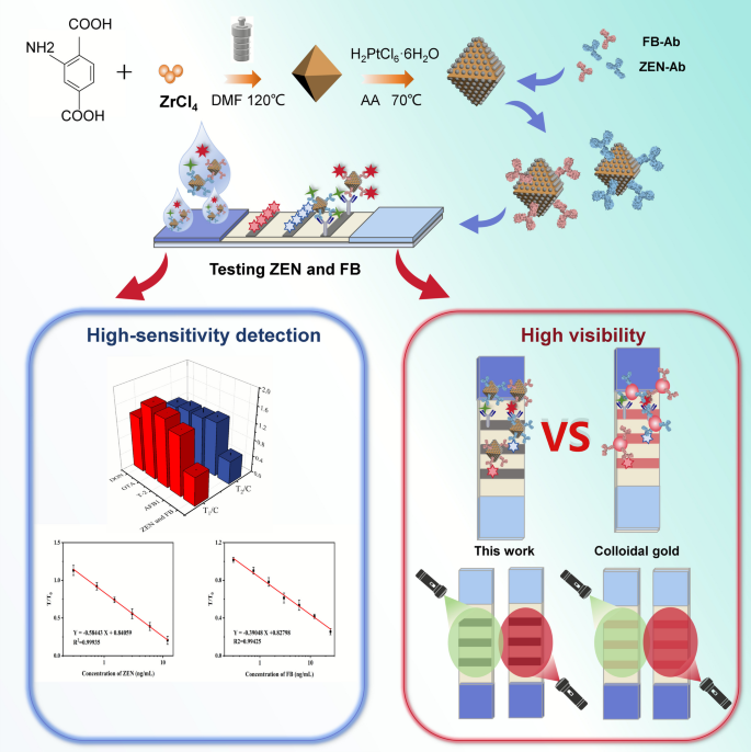 基于Zr-MOF@PtNPs的高识别度比色免疫层析试纸条,用于同步且高灵敏度检测ZEN和FB