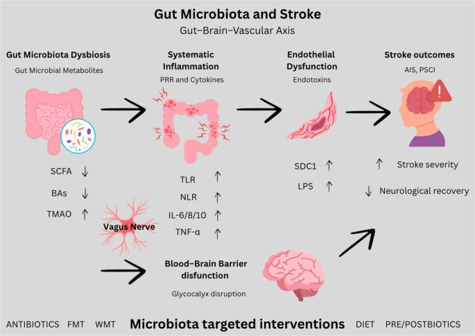 最近的临床和流行病学研究表明,特定的肠道微生物群谱与中风的严重程度和临床结局有关。肠道屏障功能的障碍以及内毒素的迁移可引发低度全身性炎症,这是脑血管事件和动脉粥样硬化形成的共同机制。此外,诸如三甲胺-N-氧化物(TMAO)、短链脂肪酸(SCFAs)和胆汁酸(BAs)等微生物代谢物已被证明可以调节内皮功能、血小板过度激活以及血脑屏障(BBB)的通透性。血脑屏障建模的进步揭示了微生物信号如何导致神经血管功能障碍。糖萼的破坏(表现为syndecan-1(SDC1)水平升高)反映了内皮损伤,可作为中风的生物标志物。此外,通过犬尿氨酸途径改变色氨酸代谢也是神经炎症的一个促成因素,从而建立了肠道菌群失调与脑血管病理之间的联系。关于肠道-大脑-血管轴的新兴证据表明,预防菌群失调可能降低中风风险,而中风后调节微生物群可能有助于促进恢复。