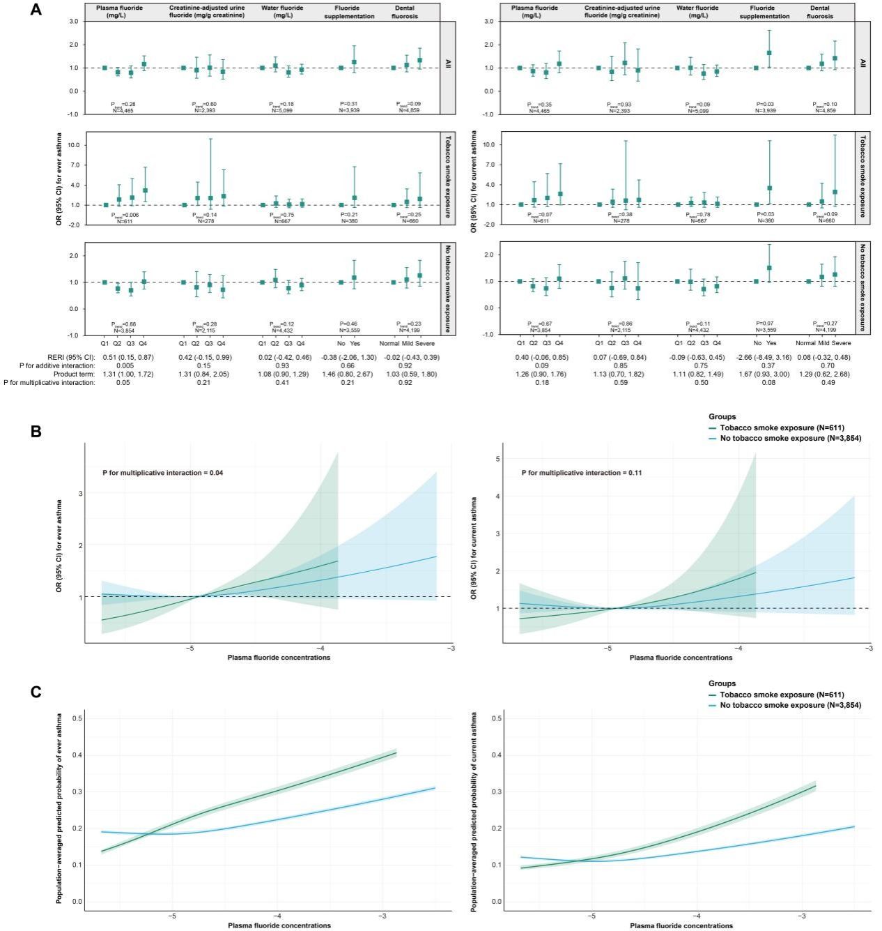本研究纳入5407名儿童和青少年,发现其血液、尿液和饮用水中均能检测到氟。在控制其他混杂因素后,在吸烟或血清中可检测到尼古丁代谢物的儿童和青少年中,血氟浓度与哮喘风险之间呈显著的暴露-剂量反应关系。限制性立方样条模型与人群平均预测概率估计分析进一步证实了在烟草暴露人群中观察到的血氟与哮喘之间的暴露剂量反应关系。进一步分析显示,氟与烟草联合暴露存在超额风险,提示烟草暴露可能增加了儿童青少年氟的易感性。氟补充剂的摄入代表了长期氟暴露,而严重氟斑牙则反映了儿童早期的氟暴露。在这些烟草暴露的儿童和青少年中,还发现氟补充剂摄入和严重氟斑牙也与当前哮喘发生风险增加之间存在暴露剂量-反应关系。饮用水中的氟浓度主要反映了近期暴露情况,本研究未发现其与哮喘之间存在显著性关联。