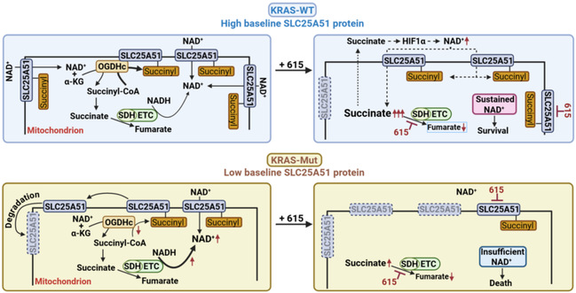 研究进一步阐明了615选择性杀伤KRAS突变细胞的深层机制。与野生型细胞相比,KRAS突变细胞中SLC25A51蛋白稳定性较低,这与其线粒体2-酮戊二酸脱氢酶复合体(OGDHc)与SLC25A51的互作下降,导致SLC25A51关键位点(K264)琥珀酰化修饰不足有关。该修饰是维持蛋白稳定所必需的。615抑制其功能后,进一步加剧SLC25A51蛋白降解,形成“功能抑制蛋白去稳定”的恶性循环,最终彻底阻断线粒体NAD+输入。同时,SDH抑制后,KRAS突变细胞因OGDHc活性低,无法大量积累琥珀酸以激活HIF1α信号通路,难以启动诸如乳酸脱氢酶介导的胞质NAD+再生等代偿机制,从而导致死亡。