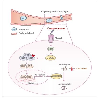 该研究运用靶向1685种代谢酶的CRISPR/Cas9体内筛选体系,发现醛脱氢酶ALDH1B1是肿瘤细胞在肺毛细血管内存活的关键因子。机制解析表明,机械挤压促使CSK23与IKKβ激酶相互作用增强,进而诱导IKKβ第177和181位丝氨酸磷酸化,激活NF-κB信号通路,最终上调ALDH1B1的表达。ALDH1B1的上调增强了肿瘤细胞对醛类物质的解毒能力,并通过抑制铁死亡,帮助肿瘤细胞在受限的血管迁移环境中存活,从而促进肺癌转移。综上所述,该研究揭示了机械力通过重塑醛类代谢调控细胞死亡的新机制,并阐明了该机制在肿瘤转移中的重要功能。这一发现不仅深化了对肿瘤细胞在受限微环境中生存机制的认识,也为开发靶向CSK23或ALDH1B1的抗肿瘤转移策略提供了新方向。