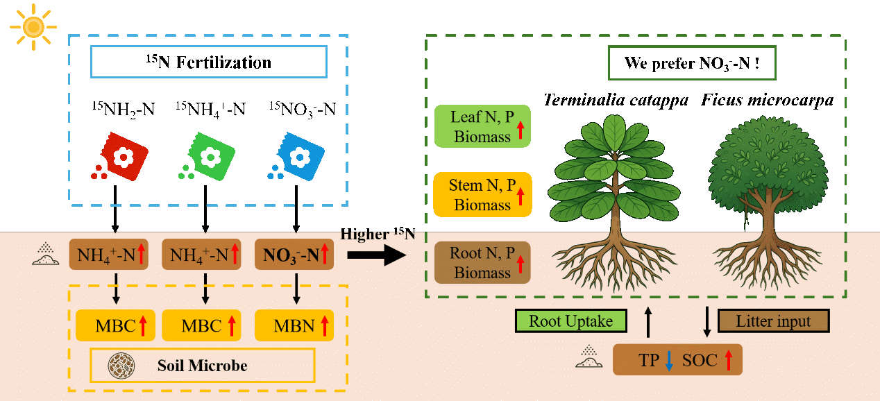 热带珊瑚岛土壤呈强碱性、保肥力弱且氮素严重匮乏。传统植被恢复常依赖增加施肥量,极易导致氮素流失及环境风险。为此,中国科学院华南植物园小良站团队利用15N同位素示踪技术,以珊瑚砂为基质,选取细叶榕(Ficus microcarpa)和大叶榄仁(Terminalia catappa)两种热带珊瑚岛适生物种,系统评估了铵态氮、硝态氮和酰胺态氮三种形态对植物生长及土壤养分固持的影响。