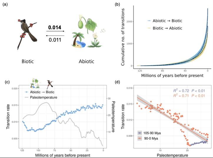 从时间动态来看,在晚白垩世早期(约 105–80 Ma),动物扩散谱系的比例显著上升,而自始新世以来其相对比例则有所下降。与此同时,从非生物扩散方式(风力扩散、水力扩散与自体扩散)向生物扩散方式(动物扩散)的转变速率在 105 Ma 后总体呈上升趋势,并与古气候变化表现出显著但动态的相关关系:在 105–90 Ma 期间,随着全球平均气温升高,该转变速率与古气温呈正相关;而在此之后,随着全球气温逐步下降,其相关关系转为负相关。研究并未发现种子扩散方式对被子植物整体的多样化速率的显著影响。