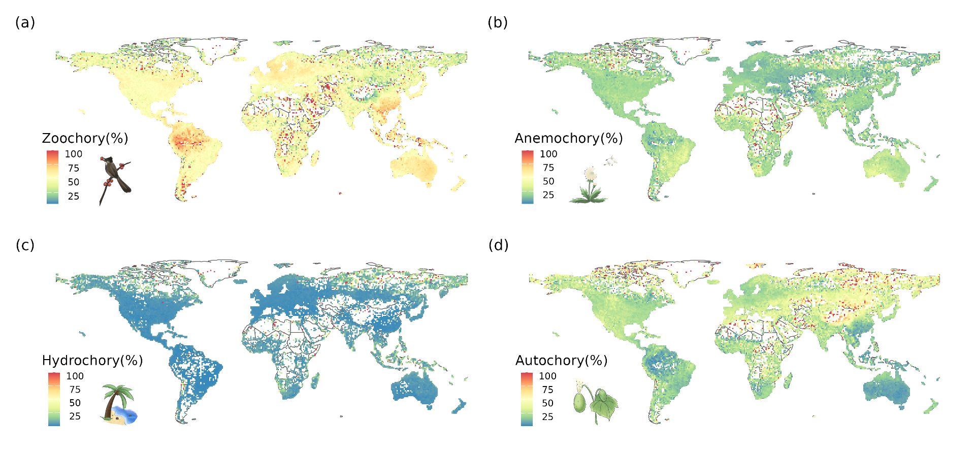 图4. 被子植物种子扩散方式的全球分布格局