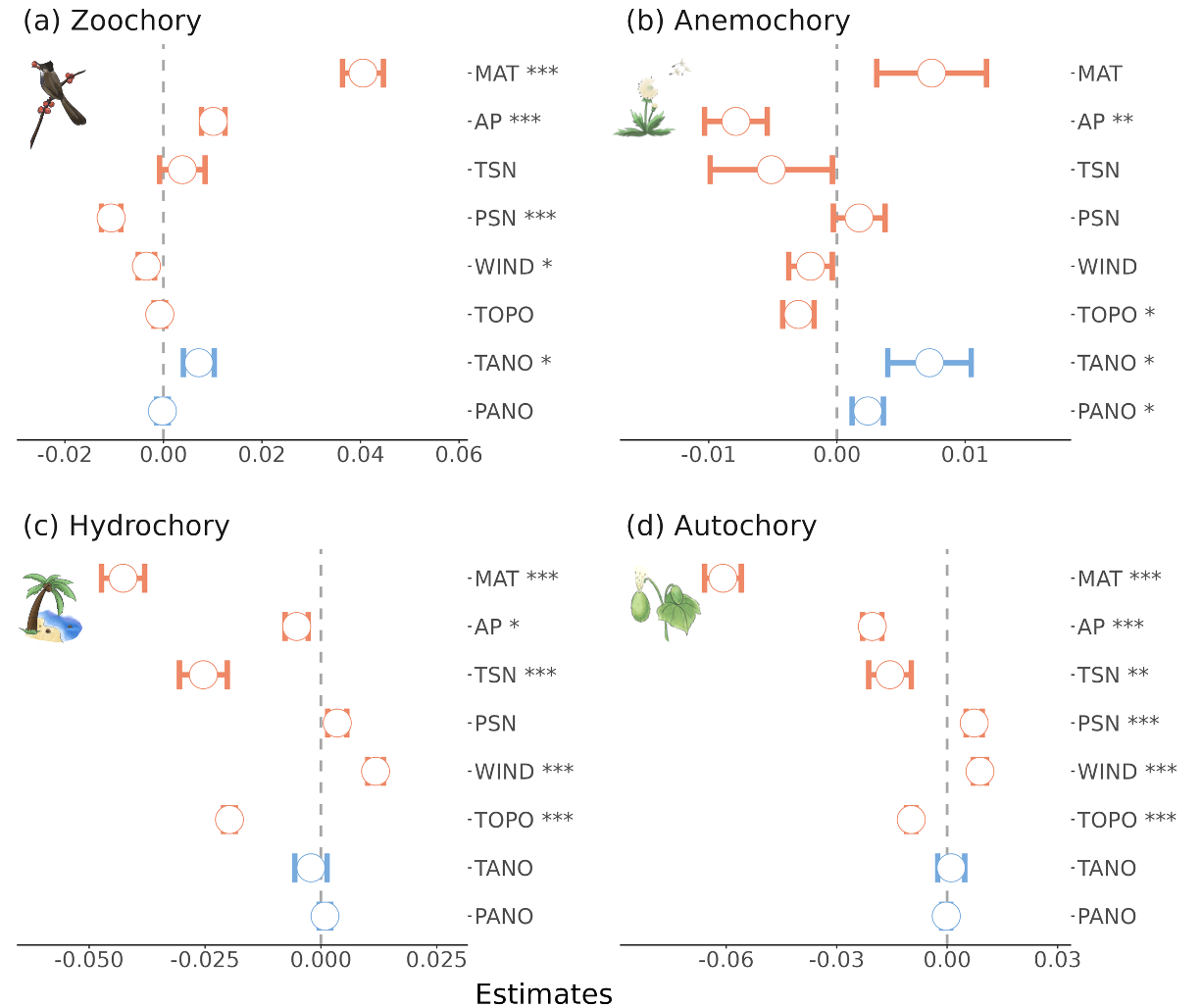 在空间分布上,种子扩散方式呈现明显的纬度梯度格局:动物扩散在低纬度地区更为常见,其比例随纬度升高逐渐降低;相反,自体扩散的比例随纬度升高显著增加。这一纬度梯度主要受年均温和年降水的共同驱动。此外,动物扩散和风力扩散的比例与末次盛冰期以来的温度变化呈显著正相关,表明长距离扩散方式在经历较强气候波动的地区可能更具优势。