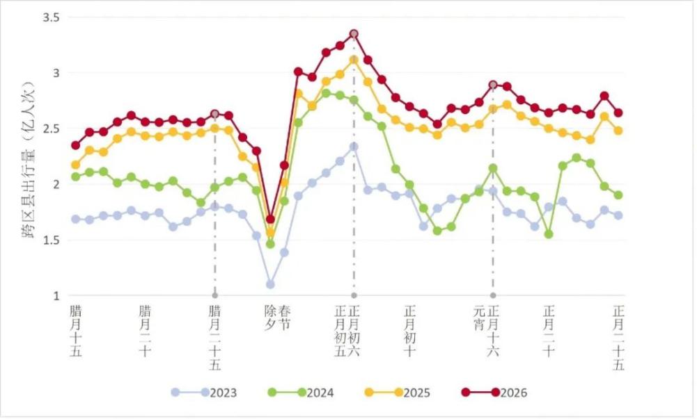 2023—2026年春运期间全国跨区县非通勤出行量潮汐变化