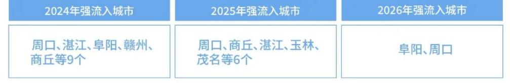 从流入型城市视角来看,强流入城市仅剩阜阳和周口两城,与去年的6城和前年的9城相比呈逐年下降态势。这一变化体现了本地就业、就近就业趋势的增强以及就地过年、旅行过年等多样化生活方式的兴起。