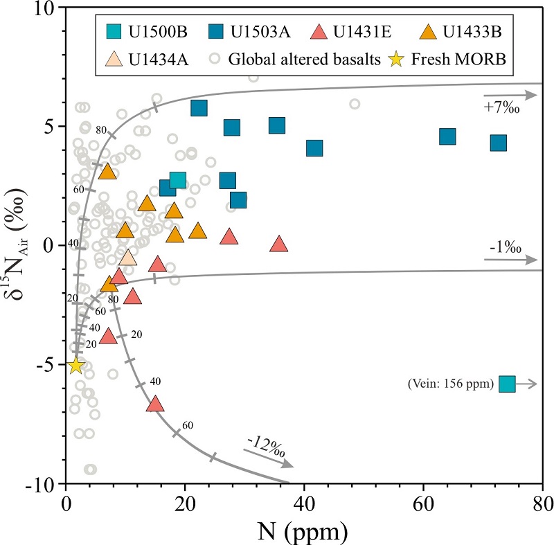 研究团队基于国际大洋发现计划(IODP)在南海钻获的玄武岩样品,系统开展了氮含量与同位素组成分析。研究发现,南海玄武岩氮含量显著高于全球大洋平均值。通过二元混合模拟,研究揭示南海玄武岩中的氮主要来源于上覆富粘土沉积物,并有少量非生物氮还原的贡献。进一步分析表明,除了周围环境次生氮可用性外,洋壳蚀变程度也是控制氮富集的关键因素。在次生氮可用性高的条件下,洋壳蚀变程度越高,氮富集越显著。基于这一新认识,研究团队重新估算出全球俯冲带上部洋壳的氮输入通量为6.8 ± 0.7 × 109 mol?yr-1,这几乎是之前估计值的两倍。