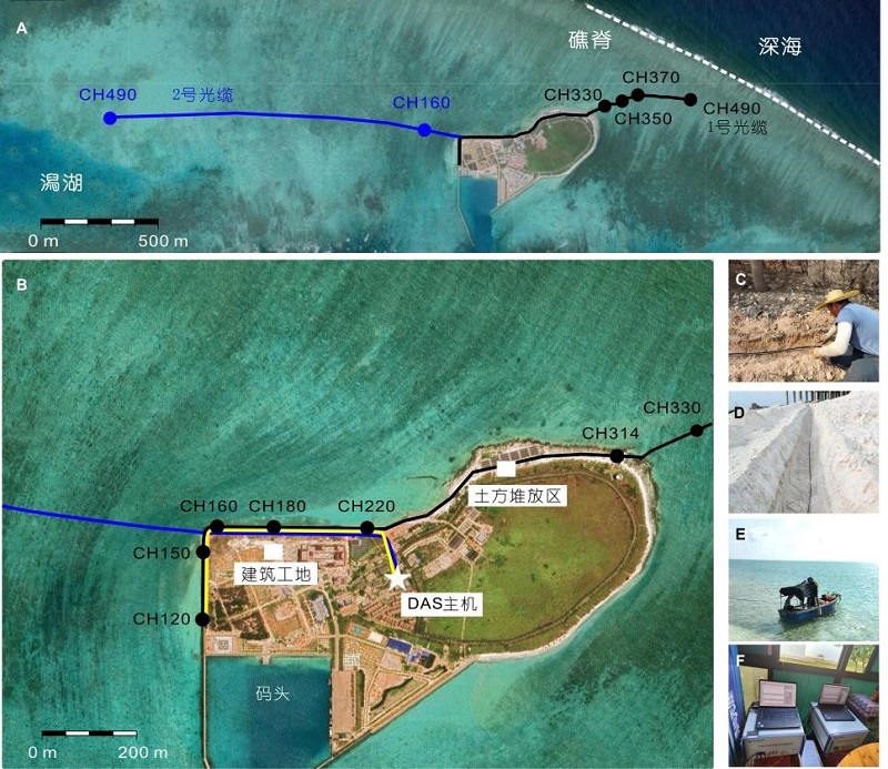 水动力过程是控制岛礁地貌发育与演化的核心因素,也是影响岛礁工程建设安全的关键。然而,传统观测因测点稀疏、成本高昂,难以连续高分辨率监测。为突破这一瓶颈,研究团队通过自主铺设光缆(图1),创新性地在西沙群岛宣德环礁的赵述岛及其周边海域部署了一套海陆一体化的DAS观测系统。