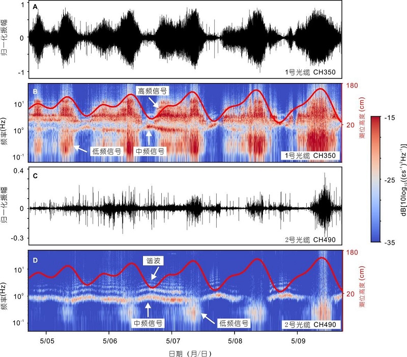该系统成功实现了对岛礁复杂水动力环境的高密度、连续监听。通过对连续5天观测数据的精细解译,研究团队成功识别并分离出多种水动力信号,包括由海表重力波(海浪)传播引起的海底应力波动、由复杂地形导致的局部湍流、在岸线破碎的拍岸浪能量以及海流流经光缆时产生的涡激振荡信号。进一步分析揭示了这些水动力信号与区域潮汐周期、风场变化及海底地形(如礁坪、潟湖、水下沙洲等)之间存在显著耦合机制。