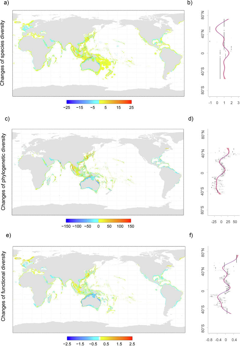 图1?2090-2100年SSP2-4.5情景下羊鱼物种多样性变化、功能多样性变化和系统发育多样性变化格局