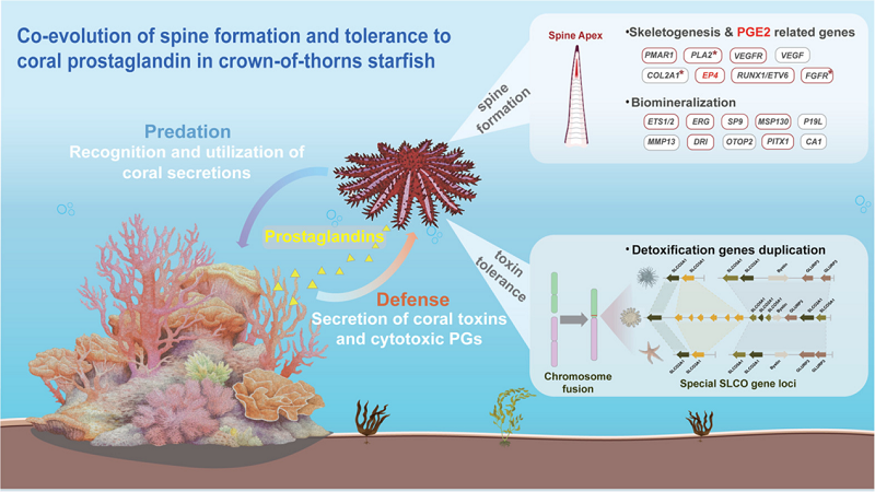 聚焦珊瑚敌害物种的防控问题,本研究对南海珊瑚礁区域长棘海星的适应与演化规律进行研究,揭示其基因组结构演化特征,发现其基因座复制导致负责前列腺素转运蛋白基因(SLCO 家族)显著扩增,明确SLCO基因扩张时间与珊瑚繁茂的时期相对应,侧面探究长棘海星对珊瑚分泌物中的毒性前列腺素 E?(PGE?)产生的适应性进化策略。结合棘皮动物普遍缺乏 PGE? 内源合成途径的特征,推断长棘海星可能通过感知并利用来自珊瑚的外源 PGE? 信号,激活骨骼形成相关的基因调控通路,从而促进棘刺与体型的生长(图2)。