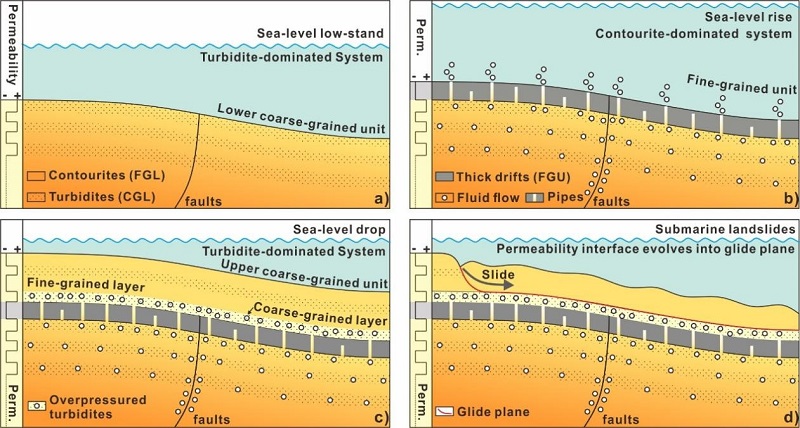 研究团队整合了南海北部逾1600 km2高分辨率三维地震、多波束测深及钻测井资料,将白云滑坡群滑动面精确锁定在上新世晚期(3.8 -3.4 Ma)海平面下降期形成的岩性界面上。该界面由高渗透浊积砂岩与低渗透泥质沉积交互组成,构成潜在流体聚集带。更重要的是,该研究进一步识别出5.0 Ma至3.8 Ma上新世早期海平面上升时期沉积的细粒等深流漂积体,以及其内部形成的流体通道群,这些通道群在百万年尺度上长期联通并持续传递流体超压,导致其上覆高渗地层逐步演变为大规模软弱层,最终促成了南海北部超10000平方千米的最大规模白云滑坡群的形成。