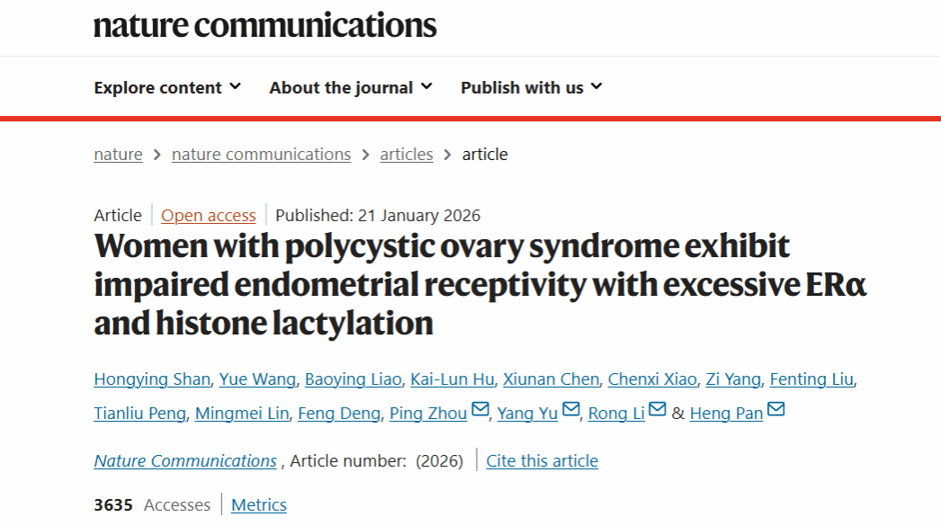 2026年1月21日,北京大学第三医院生殖医学中心潘恒研究员、李蓉教授、于洋研究员、周平副研究员团队在《自然-通讯》(Nature Communications)发表题为《ERα过度表达与组蛋白乳酸化修饰异常损害多囊卵巢综合征患者子宫内膜容受性》(“Women with polycystic ovary syndrome exhibit impaired endometrial receptivity with excessive ERα and histone lactylation”)的研究成果。该研究揭示了雌激素受体α(ERα)过度表达与组蛋白乳酸化修饰异常共同损害多囊卵巢综合征(PCOS)患者子宫内膜容受性的新机制,不仅为PCOS患者子宫内膜容受性受损的发生机制提供了新的理论依据,也对临床上建立更加安全、高效的辅助生殖体系具有重要意义。