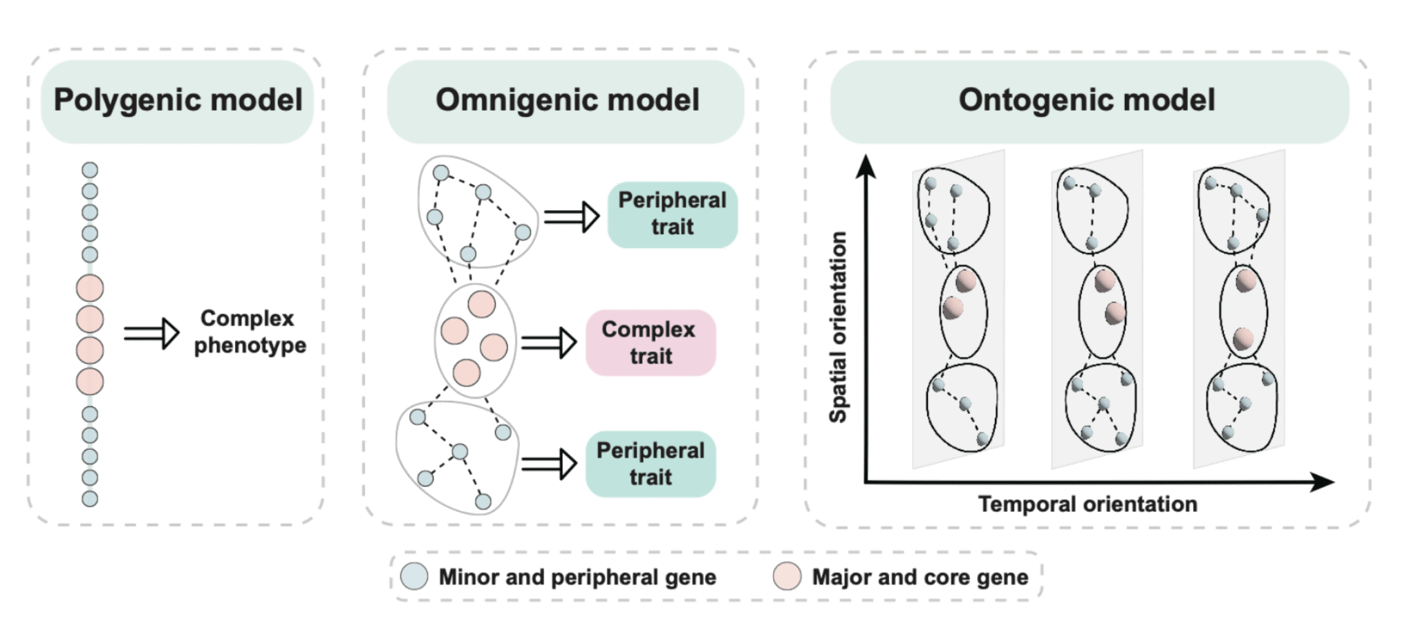 经典遗传结构模型polygenic model和omnigenic model分别从一维(基因),二维(基因、性状/基因-性状/基因)层面阐明了复杂性状的遗传结构,但是它们都是静态的,并且遗传结构随着发育会出现动态改变,这种变化涉及单个基因和基因-基因互作。因此,在该研究结果支撑下,一个新的遗传结构模型ontogenic model(个体发育模型)应运而生,从发育时间层面系统解释复杂性状的遗传基础。