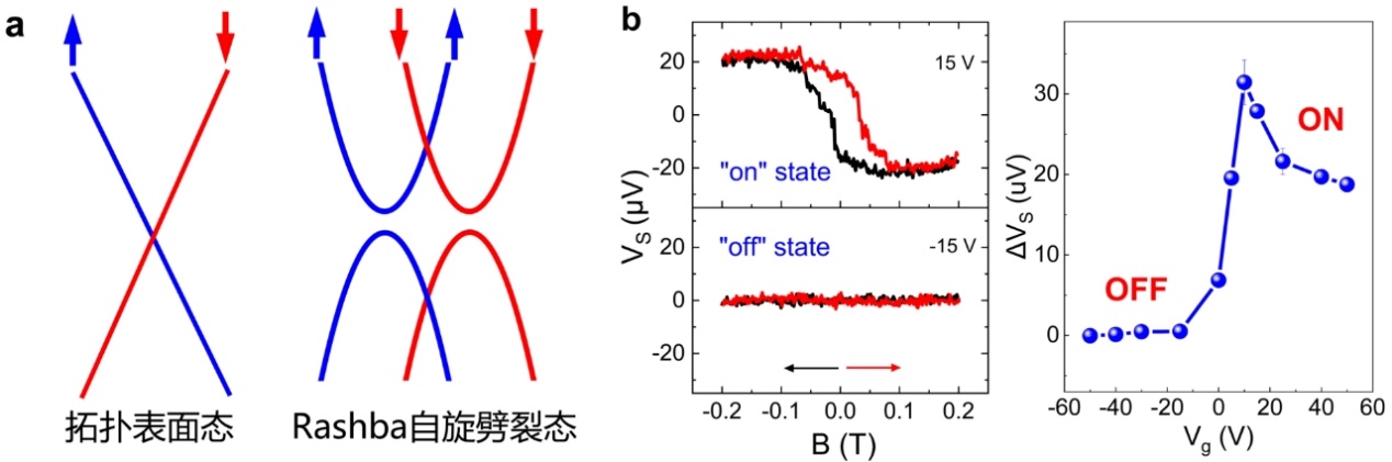 (a)拓扑表面态与Rashba自旋劈裂态的能带结构示意图;(b)Cd3As2纳米片中自旋极化电流的场效应开关行为