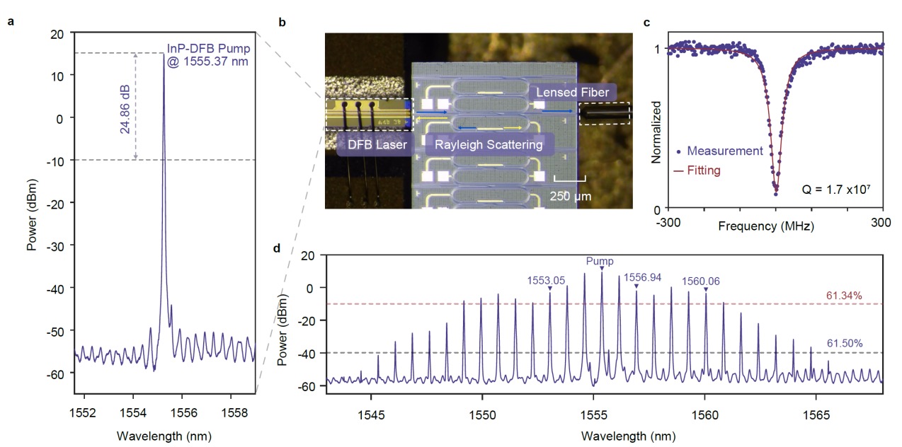 研究团队在芯片尺度上证明了光载噪比(OCNR)、线宽与传输速率之间的制约关系,并实现了单波长1Tbps的传输能力。该工作进一步通过片上波形整形与半导体光放大器的协同集成,构建了“芯片级并行载波发生器”,在将系统体积缩小百倍的同时实现了5Tbps的聚合传输容量,为“高容量、低功耗、微型化”的下一代边缘计算光互连提供了全新的技术路径。