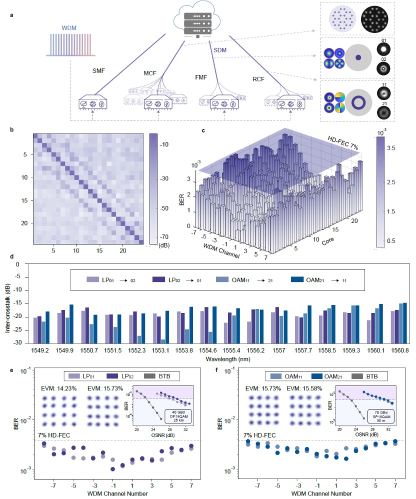 本研究通过增加空间维度来极大提升传输容量,模拟分布式边缘节点的流量聚合。实验核心是利用一根两公里的24芯多芯光纤(MCF)配合16个波长的微光梳信号,实现了高达215.04Tbps(净速率约200Tbps)的总传输速率,这是目前基于片上光源在C波段实现的最高记录。此外,实验还展示了模分复用(MDM)的能力,分别在25公里的少模光纤(FMF)中传输LP模态,以及在50米的环形芯光纤(RCF)中传输轨道角动量(OAM)模态。这证明了该微光梳光源能够兼容各种特种光纤技术,通过“波长+空间+模态”的多维复用,在不增加波长资源的情况下大幅扩展系统容量。