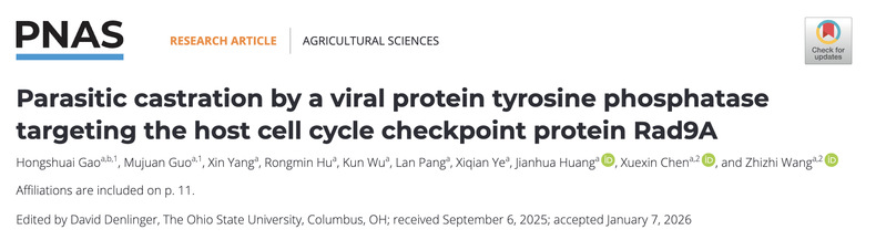 2026年2月10日,浙江大学农业与生物技术学院陈学新教授、王知知副研究员团队在国际知名学术期刊《美国国家科学院院刊》(PNAS)上在线发表了题为“Parasitic castration by a viral protein tyrosine phosphatase targeting the host cell cycle checkpoint protein Rad9A”的研究论文