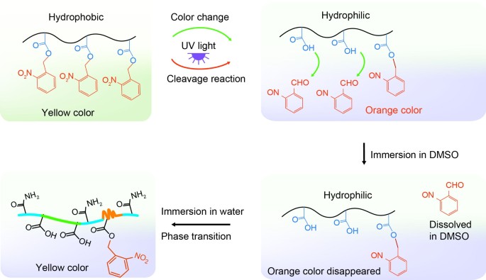 光解凝胶实现时间门控信息加密解密,通过紫外照射改变凝胶亲水性及颜色,利用空间编码与相分离特性实现可控信息存储与读取。