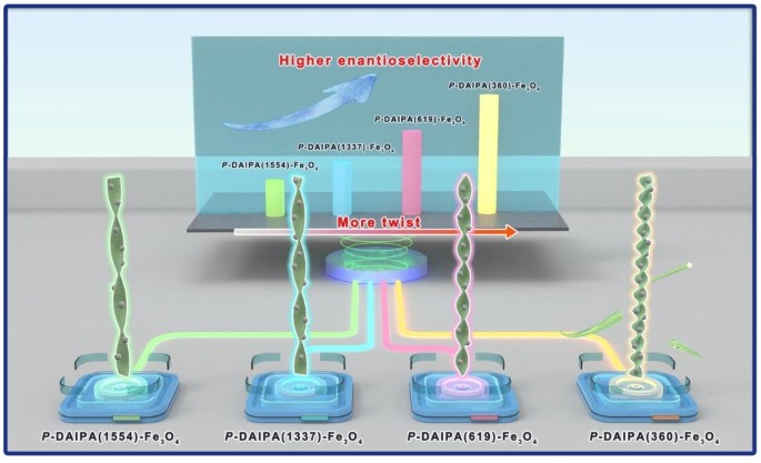 超分子螺旋纳米带通过酒精介导自组装调控螺距(360-3152 nm),Fe3O4负载后实现S-或R-3,4-二羟基苯丙氨酸的高效手性催化,发现催化选择性与螺距呈负相关,揭示溶剂诱导的螺距调控机制对构建可调手性纳米酶的普适性框架至关重要。