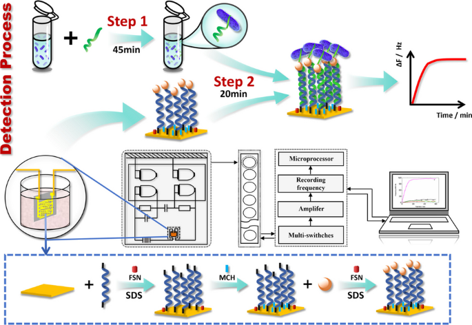 一种两步杂交-捕获适配体传感器,结合二硫醇-DNA-金纳米粒子(AuNPs)界面,可实现快速、无标记检测结核分枝杆菌H37Rv菌株