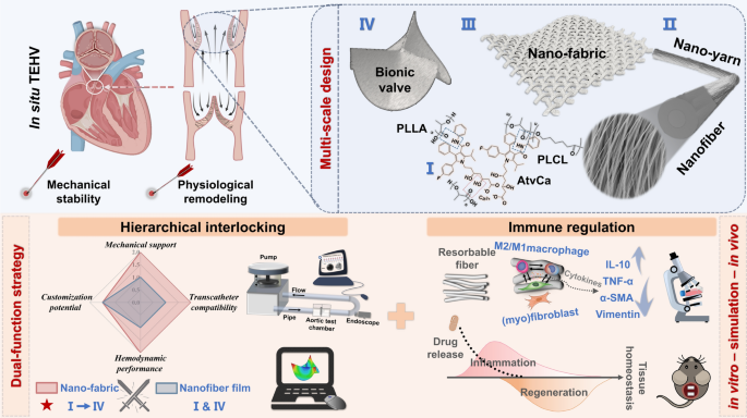 原位组织工程心脏瓣膜(TEHVs)在解决传统替代品的关键局限性方面具有巨大潜力:机械瓣膜的血液相容性不佳,生物假体瓣膜的耐用性较差,同时它们本身无法支持组织的生长和再生。然而,目前的研究主要使用单一尺度的纤维基支架,重点关注短期效果,面临长期机械不稳定性和病理重塑的挑战。在此,我们提出了一种创新的机械-免疫学策略,通过逐步结合静电纺丝、编织和热成型工艺,构建一种多尺度的全纤维TEHV支架,该支架从载药聚合物纳米纤维延伸到集成的“一维纱线-二维织物-三维瓣膜”结构。机械测试表明,这种分层互锁的架构在一维/二维尺度上表现出优异的界面稳定性、抗收缩能力、弯曲柔顺性和抗皱性能。所得到的三维瓣膜符合ISO 5840标准的心血动力性能要求,并且在瓣膜叶片逐渐增厚的过程中仍保持功能稳定性。体外/体内的生物学评估进一步验证了其生物安全性和多种功能:抵抗纤维化囊的形成、抑制α-SMA主导的病理纤维化以及通过M2巨噬细胞极化驱动的抗炎重塑。总体而言,这种机械-免疫学结合策略为临床前TEHV开发中维持功能稳态提供了潜在途径。