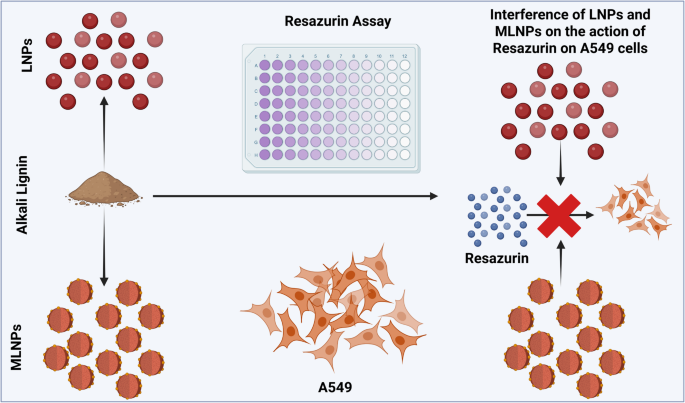 本研究通过纳米沉淀法合成甲酯化木质素纳米颗粒(MLNPs),并评估其A549细胞生物相容性。发现传统Resazurin法因纳米颗粒干扰导致假阳性结果,而MTT法能可靠评估细胞毒性,同时显微观察显示细胞形态正常。研究指出Resazurin法不适用于此类纳米颗粒的生物相容性评价,需开发替代方法。