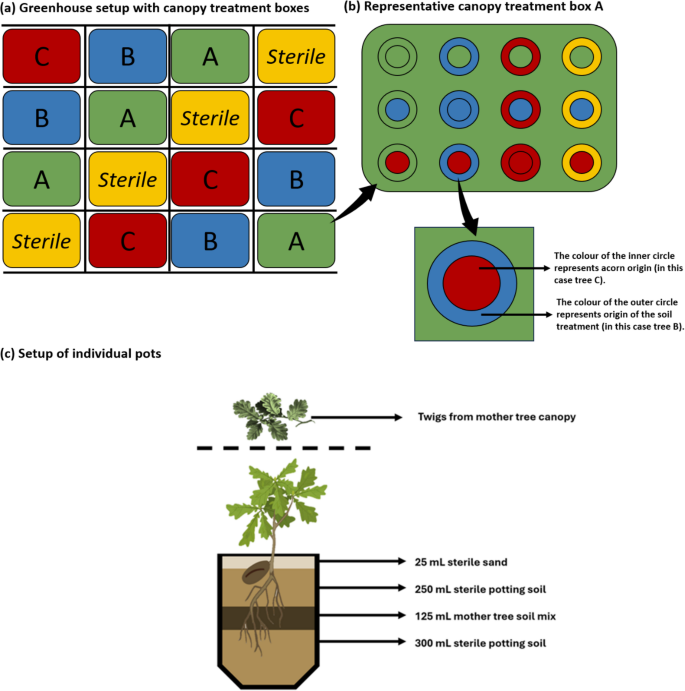 橡子在温室条件下发芽后,被分别置于不同组合的处理中:这些处理包括来自其母树(本地处理)或邻近树木(异地处理)的土壤微生物组与冠层微生物组,同时设置了无菌对照组。研究人员的实验设计宛如一个精密的“微生物调配”矩阵。