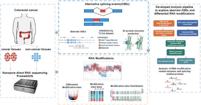 我们对北京医院手术切除的肿瘤组织和正常组织进行了纳米孔直接RNA测序。系统地识别了与CRC相关的差异性RNA修饰位点和ASEs。为了验证关键发现,我们使用了癌症基因组图谱(TCGA)中的大型患者队列,并使用AlphaFold3预测了3D蛋白质结构。然后使用TM-align对这些预测结构进行了比较。通过潜在顺式调控对的预测建模,探讨了RNA修饰与剪接之间的调控关系。同时,也对剪接事件进行了验证。