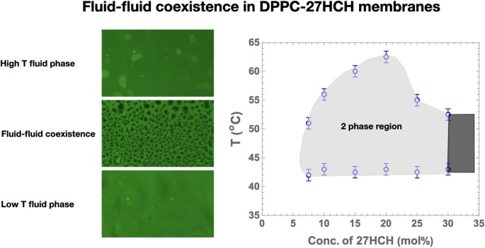 研究扩展至不同碳链长(12-16C)的对称饱和磷脂膜(PC-25HCH/PC-27HCH),发现25HCH在12-15C膜中诱导流体-流体共存,而27HCH在13-16C膜中表现类似相行为,证实相共存由羟基位置及膜厚度共同决定,且取向能受两者影响。