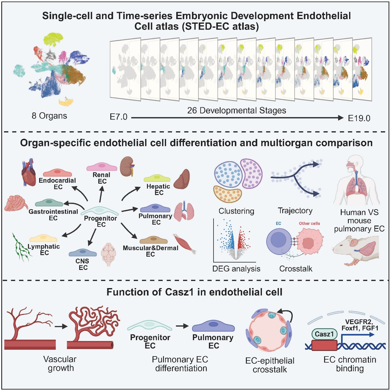 2月17日,中国科学院广州生物医药与健康研究院、华南理工大学、广州国家实验室和西湖大学联合团队在?Cell?发表题为 A single-cell time-series atlas of endothelial cell embryonic development 的研究论文。通过构建小鼠内皮细胞胚胎发育全程的谱系图(http://sted-ec.ccla.ac.cn/),发现血管内皮细胞在小鼠胚胎发育的孕中期,开始分化并逐步建立适配各个器官的内皮细胞。肺血管内皮富集基因Casz1影响肺血管生长、器官特异性分化和肺部的内皮-上皮的细胞互作。