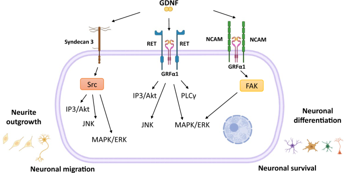 GDNF是一种由134个氨基酸组成的蛋白质,广泛表达于中枢神经系统和外周组织。它属于转化生长因子-β (TGF-β)超家族,通过一个复杂的多组分受体复合物发挥生物学功能,该复合物包括跨膜酪氨酸激酶RET和糖基磷脂酰肌醇锚定的GDNF家族受体α1 (GFRα1)。当GDNF-GFRα1复合物与两个RET分子结合并使其酪氨酸残基磷酸化后,会激活MAPK/ERK、IP3/Akt、JNK和PLC-γ等一系列细胞内信号通路,从而促进神经元的存活、神经突生长、迁移和分化。此外,GDNF-GFRα1复合物还能与神经细胞黏附分子(NCAM)或肝素硫酸蛋白多糖Syndecan-3相互作用,激活FAK或Src激酶通路,从而独立于RET发挥效应。GDNF的主要作用靶点是中脑多巴胺能神经元,同时也对去甲肾上腺素能、γ-氨基丁酸能神经元和运动神经元具有保护作用,这使得它在多种神经退行性疾病的病理机制和治疗研究中占据核心地位。
