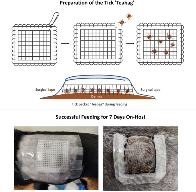 蜱虫实验性感染采用网格包裹(“茶包”)替代传统容器,在犬类宿主体表安全完成两种硬蜱(A. americanum和D. variabilis)7天吸血实验,结果显示宿主血液学及生化指标显著变化,证实该方法在蜱媒疾病研究中的有效性。