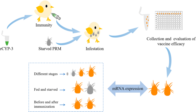 分析了不同发育阶段的Deg-CYP-3在螨虫中的mRNA表达情况,以及其在进食和饥饿条件下的表达情况。随后,诱导产生了重组蛋白rCYP-3,并对其进行了纯化,用于免疫接种。免疫接种后,检测了抗体水平,并进行了螨虫攻击实验。在螨虫对雏鸡吸血12小时后,收集螨虫以评估rCYP-3疫苗的杀螨效果。
