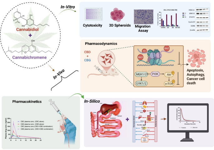 三阴性乳腺癌(TNBC)对多柔比星(DOX)耐药会显著影响疗效,研究首次评估了CBD与CBC联合治疗DOX耐药性TNBC的抗肿瘤机制及药代动力学。体外实验显示联合治疗具有协同效应,抑制细胞周期G0/G1期并减少55%的侵袭性。体内实验表明,联合用药使肿瘤体积缩小四倍于单药及对照组。机制研究揭示MEK/ERK、PI3K/AKT/mTOR等通路关键蛋白(Cyclin D1, CDK6, SOD2, NF-κB)表达下调。药代动力学分析显示联合用药提升Cmax和AUC达1.8倍,GastroPlus模拟验证了肠道吸收增强。该研究为克服DOX耐药提供了CBD+CBC协同抑制肿瘤生长和侵袭的新策略。