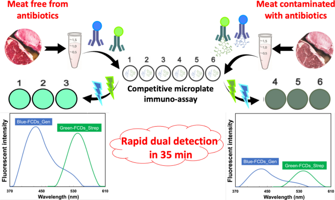 氨基糖苷类抗生素在肉类中的残留检测存在健康风险,本研究开发出基于双色荧光碳点联抗体的微孔板免疫检测法(MIA-DFCDs),实现gentamicin(0.32 ng/mL)和streptomycin(0.13 ng/mL)的同步快速检测(35分钟内),检测性能与UHPLC-MS/MS相当,且成本更低。
