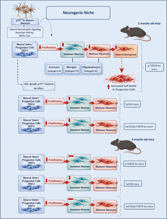 p75神经营养因子受体(p75NTR)在成年海马齿状回中的功能示意图。在生理条件下,p75NTR通过细胞非自主微环境机制支持神经干细胞(NSC)的增殖、适当的神经元分化和成熟,这可能是由成熟神经元中的p75NTR表达介导的。删除p75NTR会减少NSC增殖,导致未成熟神经元积累,影响神经元最终成熟,并增加海马神经发生微环境中的细胞死亡;而特异性删除NSC则没有影响,表明这是外部调节而非干细胞或胶质细胞的内在缺陷。在5xFAD阿尔茨海默病(AD)小鼠模型中,疾病早期阶段NSC增殖和未成熟神经元生成会暂时增加,但在5xFAD/p75NTR敲除小鼠中这种补偿性反应消失。到4个月时,5xFAD小鼠的增殖和未成熟神经元生成减少,p75NTR的删除进一步加剧了这些缺陷,表明其在AD早期阶段的关键作用,同时也突显了p75NTR作为海马区神经发生的关键调节因子。