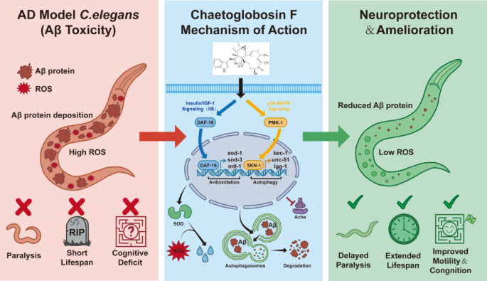 阿尔茨海默病(AD)神经保护机制研究: Chaetoglobosin F(CF)在C. elegans模型中通过调节胰岛素/IGF-1通路和p38 MAPK信号轴,抑制Aβ斑块形成、降低ROS水平、促进自噬体生成,同时抑制乙酰胆碱酯酶活性,显著改善运动和认知功能,延长寿命并上调抗氧化与自噬相关基因。