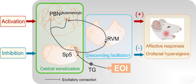 从解剖学上看,Sp5直接投射到LPBN。在接收Sp5输入的LPBN神经元中,85.8%为谷氨酸能神经元,4.1%为GABA能神经元。LPBN再向RVM投射,其中71.4%的投射神经元为谷氨酸能神经元,9.1%为GABA能神经元。然而,仅有少数接收Sp5输入的谷氨酸能LPBN神经元会进一步向RVM投射。从功能上看,激活Sp5-LPBN谷氨酸能通路增强了RVM中的ON型神经元和Sp5宽动态范围(WDR)/非特异性(NS)神经元的反应,增加了RVM神经元和谷氨酸能Sp5神经元中的钙信号,引起了口面部痛觉过敏,并引发了与疼痛相关的厌恶行为。重要的是,抑制这一通路可以逆转EOI模型中观察到的类似参数变化。