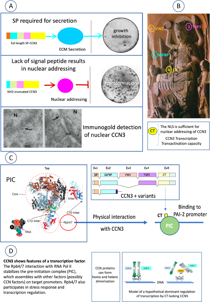图A:CCN3的双重生物学效应。通过pRSV重组载体在鸡胚胎成纤维细胞(CEF)中表达全长CCN3会导致CCN3的分泌并显著抑制细胞生长。最初在肾母细胞瘤中观察到的氨基酸截短型CCN3的转化潜力,通过用携带从同一肿瘤中克隆的截短CCN3 DNA的pRSV载体感染CEF在体外得到了验证。图B:CCN3模块的组合效应。分泌的CCN3蛋白通过其组成模块表现出组合生物学活性。每个模块可以单独执行特定功能,或者共同生成全长蛋白中的新功能,突显了“模块化一体”的概念。图C:RNA聚合酶II(Pol II)的预启动复合物。由12个亚基组成的Pol II预启动复合物(PIC)包含一个突出的rpb4/rpb7异二聚体,该异二聚体稳定了复合物并增强了其与转录因子的相互作用能力。双杂交实验表明CCN3在此层面上与Pol II发生物理接触。CCN3的C末端(CT)结构域与PAI-2启动子的结合支持CCN3在调控PIC进程及其与TFIID/TBP家族调节因子相互作用中的作用。图D:CCN5作为主要调节因子。某些转录因子需要二聚化才能调控目标基因。具有CT和VWC结构域的CCN蛋白质可以通过二聚化或多聚化来正向或负向调节转录。缺乏CT结构域的CCN5仍可以通过VWC结构域进行二聚化,并在CT介导的二聚化对启动子结合和转录调控至关重要的情况下发挥主导负调控作用。