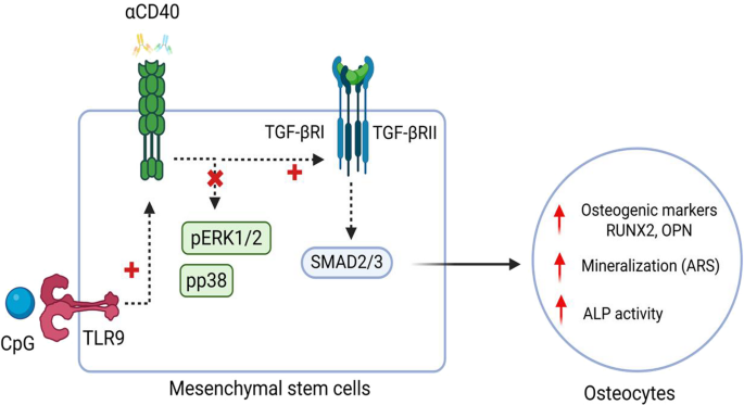 免疫-骨骼界面中CD40通过激活TGF-β/Smad2/3通路促进骨髓间充质干细胞成骨分化,同时与TLR9协同作用增强骨再生效果,该机制具有物种独立性,为骨质疏松和骨折修复治疗提供新靶点